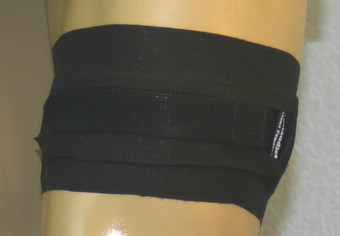 Tape the top and bottom edges of the strap to leg skin (or compression shorts) with athletic tape. Do not cover the handle opening with tape. See our Athletic Tape.